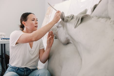While completing her studies, a friend encouraged her to take a figure sculpture class. Her first piece was a self-portrait, followed by a life-sized rearing horse sculpture titled Becoming One, which now resides among the trees at Stone Quarry Hill Art Park in Cazenovia, New York.